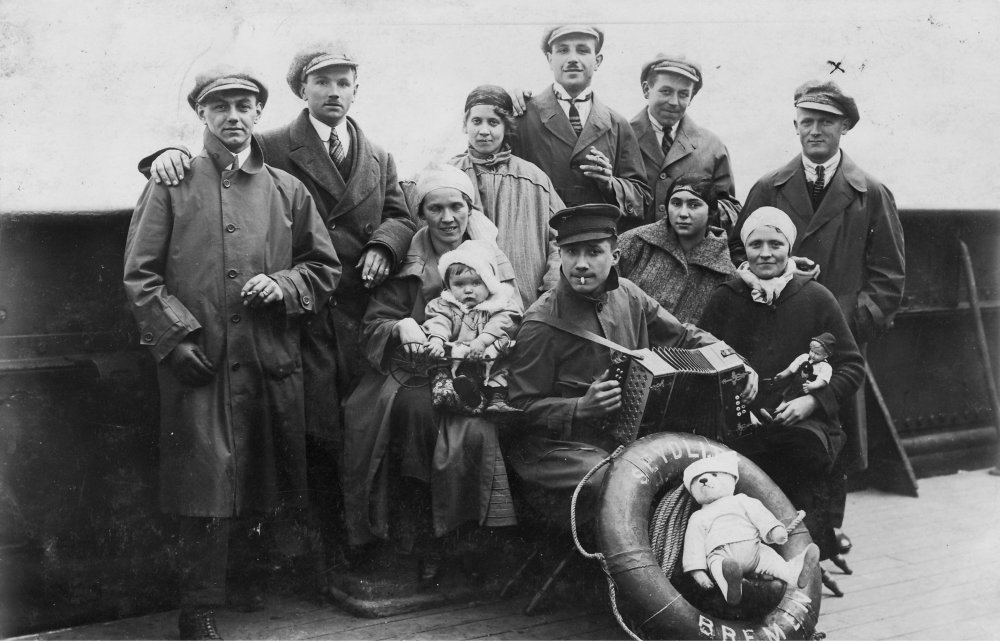 Nach aktuellem Kenntnisstand ist der junge Mann ganz rechts (er hat ein kleines Kreuz über seiner Mütze) Julius Zeeb aus Gomaringen. Er wollte mit einer Mähringer Auswanderungsgruppe 1924 nach Blumenau in Brasilien auswandern, um so eventuell einfacher in die USA zu seiner Ex-Verlobten zu gelangen.