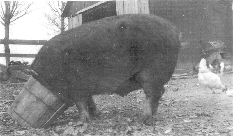 Rather than using a part of the barn for grain storage, Great Grandfather built a separate granary. Looking like small barns, these structures were typically rectangular buildings with gable roofs and had no windows or openings which was supposed to discourage rats, mice, and other rodents from getting in. Often these were double-walled for more protection of the grain stored within and sometimes they were built on piers. According to Noble and Cleek, these granaries were usually associated with German, Scandinavian, or eastern European immigrants, and so it is appropriate for Jacob Walker and his wife, Elizabeth, who were both German and living in a strong German community in eastern Indiana (Noble and Cleek 154). Here Great Grandfather stored his shelled com, wheat, oats, and barley on one side and unshelled com on the other. Granddaughter Peg Barnes remembers that the buggy was also housed in the middle of the granary and the chicken yard, where her Grandma’s chickens, geese, and ducks were kept, was conveniently located next to the granary. Grandma Walker, Peggy says, swept the chicken yard every day. It can be seen adjacent to the granary on the east side in an rare old photo dating before 1919. Partially visible in this photo is one hen house, but Peg remembers that there was yet another chicken house further east. Pigs, she recalled, were sometimes kept down at Uncle Fred’s place just a half mile away, but baby piglets rejected by their mothers were wrapped in a black blanket and kept behind the stove in Great Grandma’s summer kitchen and hand-fed until they were big enough to live on their own.
