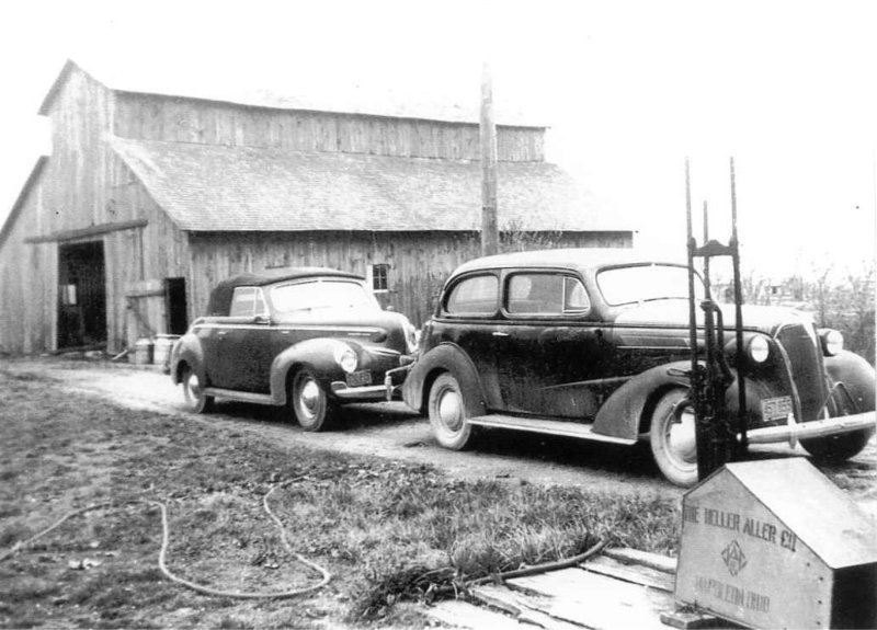 Next to the milking barn, on the west side, was a com crib barn for drying and storing com on cobs. It was a double-pen style with an open drive through the middle. Here the corn (on cobs) was loaded by hand into the cribs and left to dry. The space in the middle was used to keep the wagon. When Pop started farming corn production generally averaged 40 bushels to the acre, but in 1924 Iowa State University began experimentation with breeding of corn for seeds that would produce 100 bushels or more per acre. As the newly developed hybrids became more readily available, corn production increased and larger facilities were required for storing and drying the corn were needed. With the introduction of corn-picking machines in 1931, corn could be picked at a faster rate and this encouraged even more corn production. At some point in time the corn crib had a lean-to built onto one side that was used for parking the car and later torn down when it became obsolete.